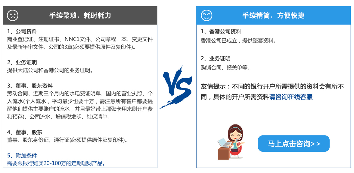 香港作為全球金融中心之一,吸引著眾多投資者前往香港投資并開立香港銀行賬戶。但每間銀行對開立賬戶的要求及所需提供的資料各有不同,企業(yè)董事往往因資料不齊或不了解開戶程序,而需另約時(shí)間前往銀行咨詢,此舉往往耽誤管理層的寶貴時(shí)間。